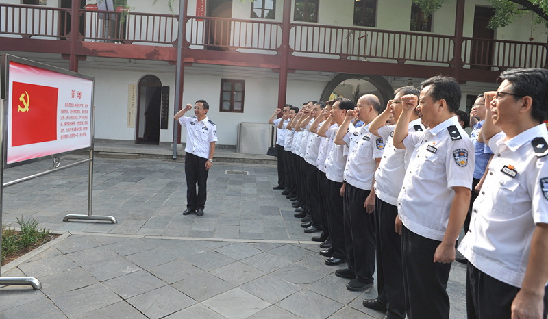 局机关领导干部和各处室负责人及局机关民警代表在中共七大会址前重温入党誓词
