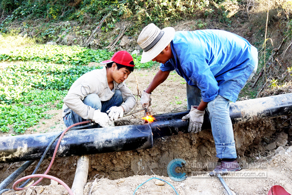 管道工们正在焊接通向龚家院村自来水管道