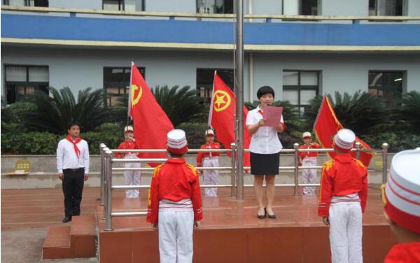 庄严的升旗仪式中,校国旗班队员迈着整齐的步伐、旗手们手持着国旗、党旗、团旗、队旗,精神抖擞地向升旗台前豪迈前行,鲜艳的五星红旗伴随着《国歌》声冉冉升起,共和国那一抹红色在校园里迎风飘扬。