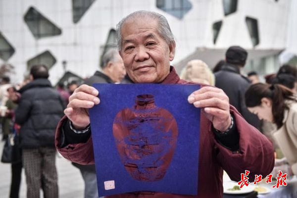 “武汉好手艺”民间工艺技能传承大师刘国瑞向居民展示剪纸 记者任勇 摄