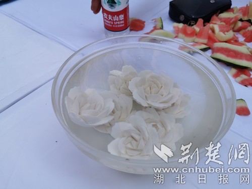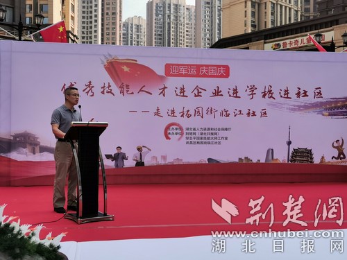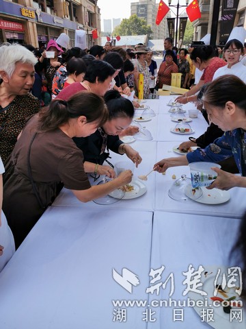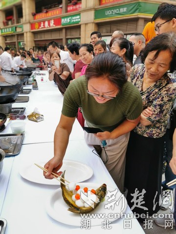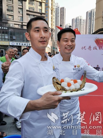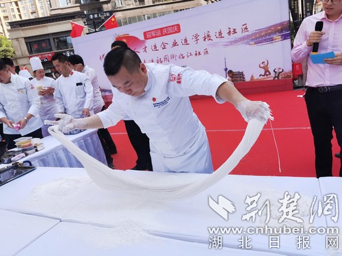 荆楚网客户端—荆楚网消息(记者徐蕾)在西瓜上面雕刻出来的玫瑰花和金猪祥瑞、从杀鳝鱼到装盘只需3分钟的大刀爆鳝花、拉到一人多长的龙须面、可以当成气球一样吹起来的面团,一道道精雕细琢的菜品在一群烹饪高手的手中一一呈现出它们最美的姿态,给现场的居民们带来了视觉与味觉上的双重盛宴。9月27日上午,“优秀技能人才进企业进学校进社区”湖北首场活动在武昌区杨园街临江社区隆重举行。该活动由湖北省人力资源和社会保障厅主办,荆楚网(湖北日报网)、邹志平国家技能大师工作室、武昌区杨园街临江社区承办。