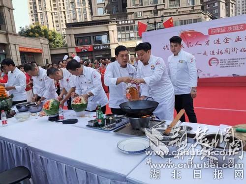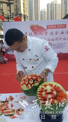 荆楚网客户端-荆楚网消息(记者徐蕾、黄康)在西瓜上面雕刻出来的玫瑰花和金猪祥瑞、从杀鳝鱼到装盘只需3分钟的大刀爆鳝花、拉到一人多长的龙须面、可以当成气球一样吹起来的面团,一道道精雕细琢的菜品在一群烹饪高手的手中一一呈现出它们最美的姿态,给现场的居民们带来了视觉与味觉上的双重盛宴。9月27日上午,“优秀技能人才进企业进学校进社区”湖北首场活动在武昌区杨园街临江社区隆重举行。该活动由湖北省人力资源和社会保障厅主办,荆楚网(湖北日报网)、邹志平国家技能大师工作室、武昌区杨园街临江社区承办。