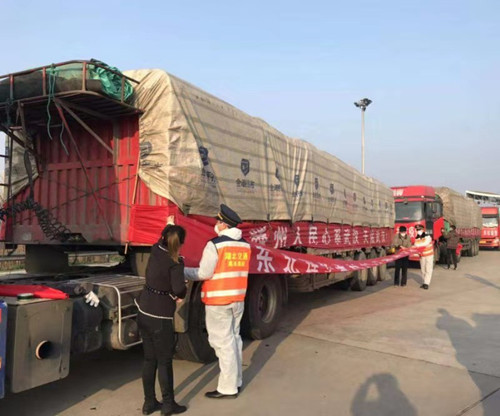 早上8时30分,京港澳高速武汉西收费站外广场,4辆挂着“华控集团心系武汉疫情”大红条幅的半挂车整齐排列,据车队负责人介绍,此次运抵的126吨新鲜水果蔬菜由华控集团捐赠,分别有30吨秋梨、32吨白菜、64吨土豆,都是武汉市目前急需的水果蔬菜,将被分别送往武汉市第一医院、武汉市第四医院、武汉市中心医院、武汉儿童医院等9家医院及社区。