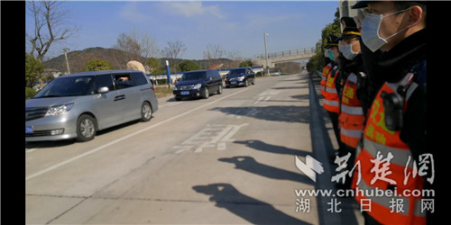 荆楚网客户端—荆楚网消息(通讯员王耀华、余文兵)2月17日,来自江苏省媒体记者采访组的5台车辆20名记者,在湖北省交通运输厅高速公路路政执法黄黄支队路政人员精心安排和沿途护送下,顺利与黄石市委宣传部进行对接。他们将以笔为“矛”,奋战在疫情前线,深度报道江苏援助湖北医疗队一线抗“疫”工作。