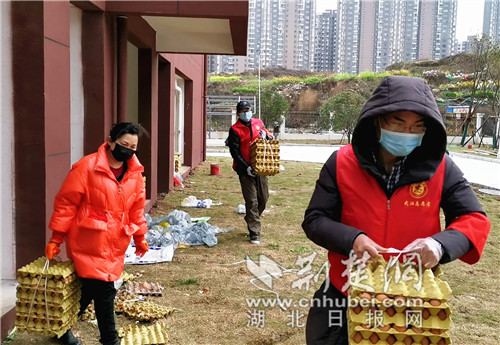 13时开始,分发昨日住户登记的生活物资等,为小区内残疾、孤寡老人上门测体温、送物资。