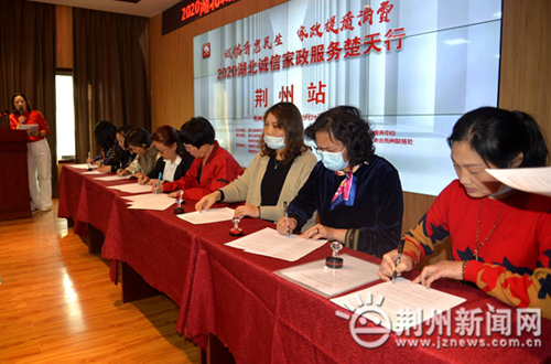 活动现场,湖北省家庭服务业促进会与全市33家进入商务部家政信用平台的家政服务企业签署《湖北家政放心消费承诺书》,并向这些企业颁发“湖北家政服务放心消费承诺单位”证牌。