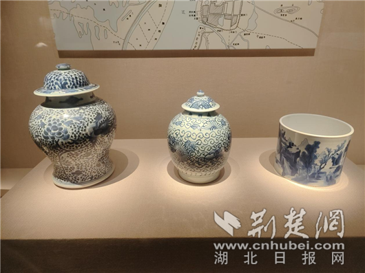 左:清 青花瓷“凤穿牡丹纹”将军罐 中:清 青花瓷菊花纹盖罐 右:清康熙 青花人物故事笔筒