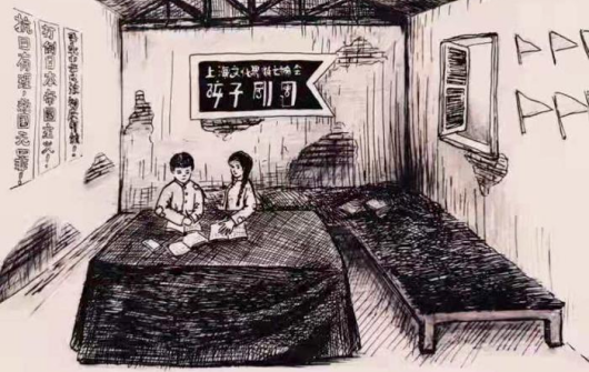2021年,学校启动了一项意义深远的工程:以石碑为核心,精心设计打造了红色文化墙和“孩子剧团”红色主题馆。他们将孩子剧团的关键事件以照片配文字的方式进行展示;将《孩子剧团访问记》中关于孩子们在“生活室”读书、唱歌、写作的生动描述,以素描画进行历史场景复原;收集珍贵的孩子剧团相关书籍供大家借阅……这个场馆是生动的“实景思政课堂”,将历史转化为鲜活的教材。
