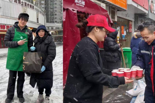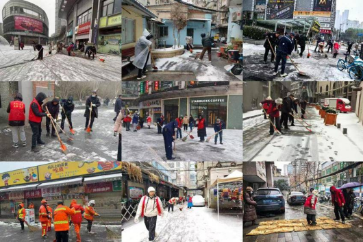 街道党工委充分整合辖区优势资源,统筹商圈各类主体,快速响应、协同作战。商圈内150余家商户自觉落实“门前三包”责任,主动组建“门前清雪队”,确保责任路段畅通;以快递员、外卖骑手为代表的新就业群体也化身“流动新力量”,利用工作间隙协助社区清理背街小巷与主要出入口;各楼宇物业企业积极履行主体责任,不仅完成自有区域除雪,更组织人员支援周边市政路段清扫工作。与此同时,8个江城驿站全面开放,面向户外工作者等提供热饮热茶、取暖休息等贴心服务,星巴克、萍姐火锅等爱心商户“闻讯而来”,自发为一线人员提供热饮与休憩场所,传递出“雪中送暖”的商圈温度。