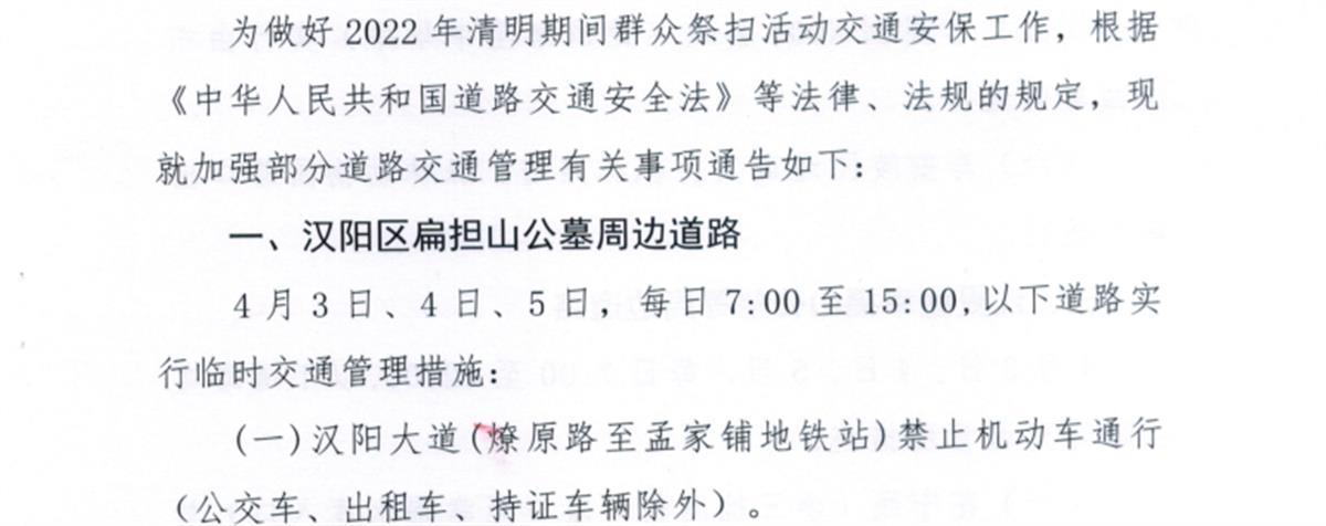(一)汉阳大道(燎原路至孟家铺地铁站)禁止机动车通行(公交车、出租车、持证车辆除外)。