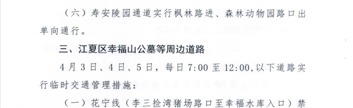 (七)白汊湖陵园区域道路(白汊路、汉江堤等)、荷包湖公墓进出通道、辛安渡陵园区域道路(张辛路、集汉路、古渡路、汉宜路等)、南山陵园(东柏路、东采路等)、顺港陵园区域道路禁止车辆停放,并视情采取交通管制措施。