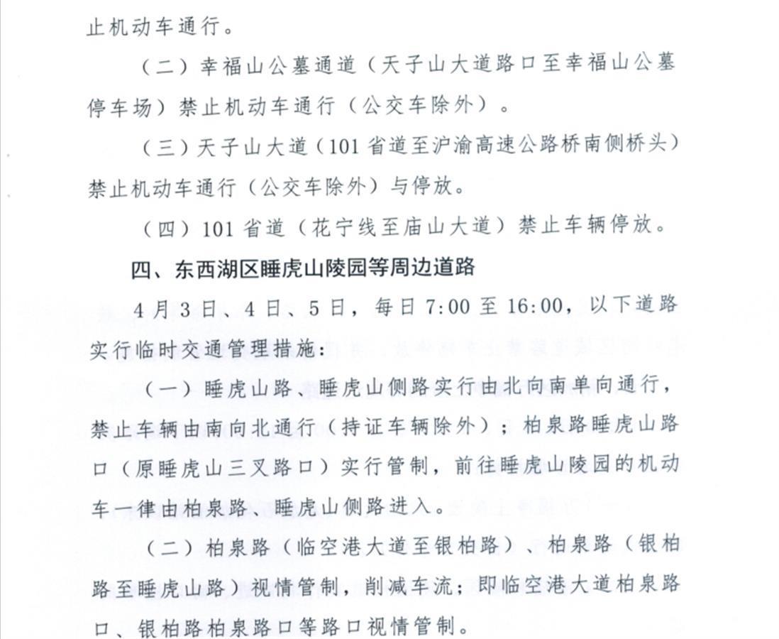 4月3日、4日、5日,每日7:00至16:00,以下道路实行临时交通管理措施: