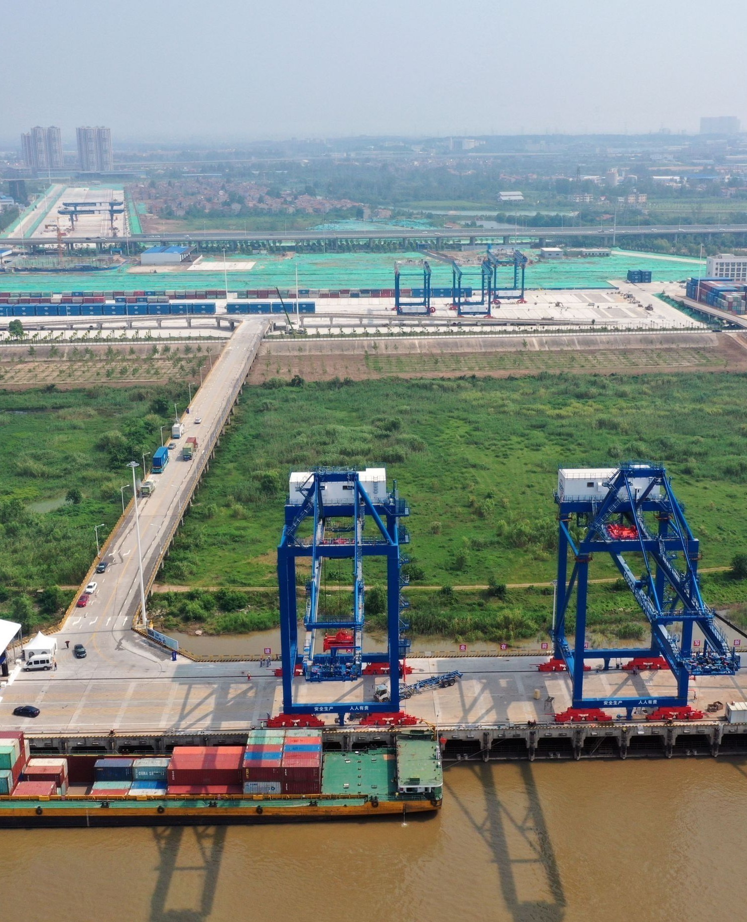 项目位于新洲区阳逻经济技术开发区,建设总面积约852亩,总投资约27亿元,主要包括:码头作业区、铁路作业区、附属作业区。码头作业区建成4个集装箱泊位,可靠泊作业1140标箱大型船舶。铁路作业区建成1束1050米铁路装卸线,实现整列到发。附属作业区为水铁联运工程提供拆装箱、洗修箱、空箱堆存等配套增值物流服务。