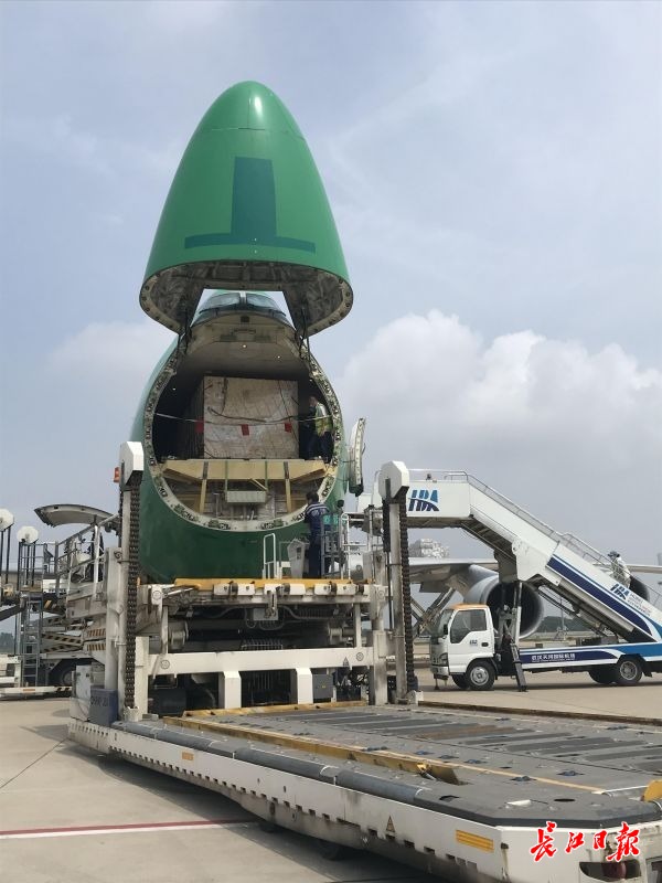 长江网记者在现场看到,机场航空物流公司十多位装卸工操作着多台升降平台车,从飞机上卸货。为了卸载一个大件货物,飞机头被打开,宛如一个子弹壳朝天,一件长8米宽2米多的大件货物从飞机头缓缓地运往平台车上。“这是4月8日以来第一次从飞机头卸货,平常这种操作也不太多,就是为了应对超长超大货物。”现场操作负责人告诉记者。