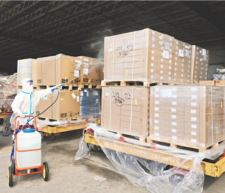 工作人员对国际航班货物消杀。 胡婧 摄