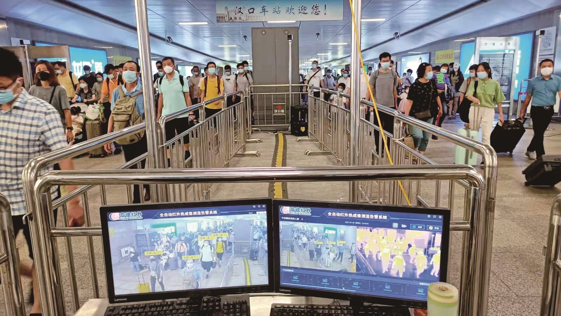 在汉口火车站出站口,从国内低风险地区返汉出站的旅客,经过三台红外线热成像仪的交叉扫描后,确定为正常体温的旅客,方可刷身份证出站。同进站一样,若热成像仪扫描到发热旅客,则会立即锁定,工作人员会迅速将其带到隔离间,等待疾控中心的工作人员的进一步处理。