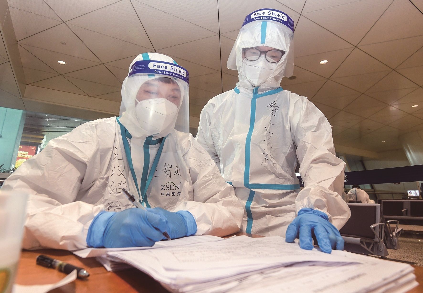 “麻烦出示一下您的证件、健康码,填写一下表格。”在T3航站楼一楼出口处,武汉市各区名称的标牌沿一条线横向排列,每个区都至少有两位身着防护服的工作人员坐在桌前,等待回汉人员。江汉区防疫专班成员王智超就是其中一员。