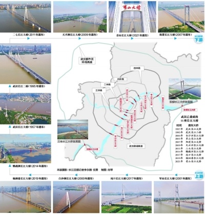 依江而兴的武汉拥有一张靓丽名片——“世界建桥之都”。1957年,武汉长江大桥建成通车。时隔38年后,1995年武汉长江二桥建成通车。进入2000年后,随着武汉城市环线不断加密,先后有9座跨越长江的大桥建成通车,截至目前,武汉已建成11座长江大桥。除年内即将开工的双柳长江大桥、汉南长江大桥外,规划建设的还有光谷长江大桥、白沙洲公铁大桥等。
