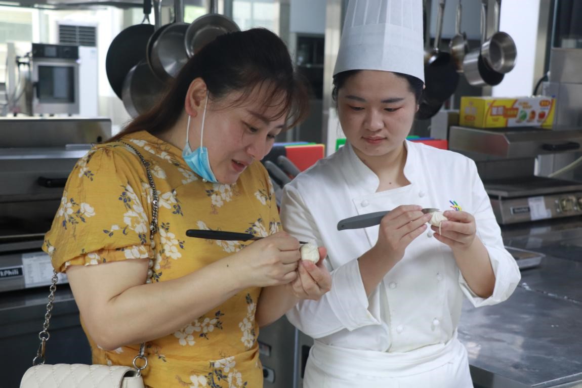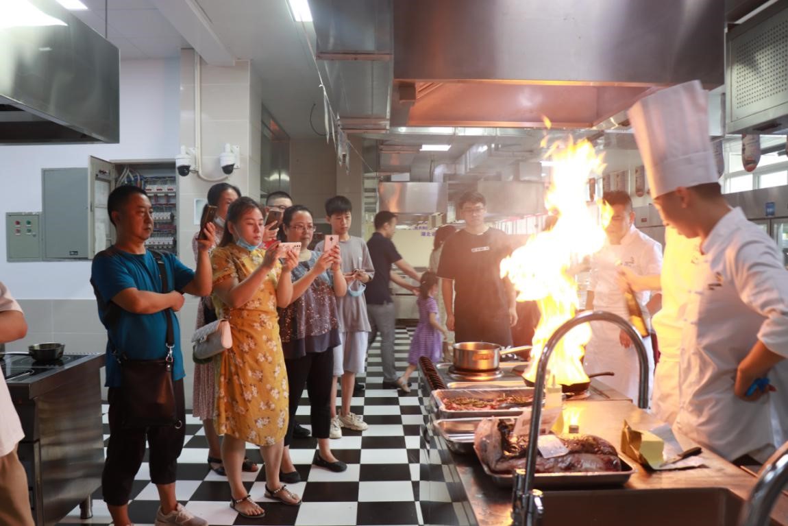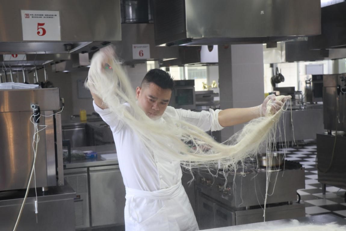 体验开始,王波老师为大家表演龙须拉面绝技,最后拉出来的龙须面极细,简直可以“穿针引线”,还可以用火点燃,体验者们纷纷拿出手机录制下这一神奇技艺。“基地里的所有设备都是根据世赛标准采购的国际一流厨具。”展示完绝技,王波老师很自豪地向观众介绍操作台上的设备和工具。