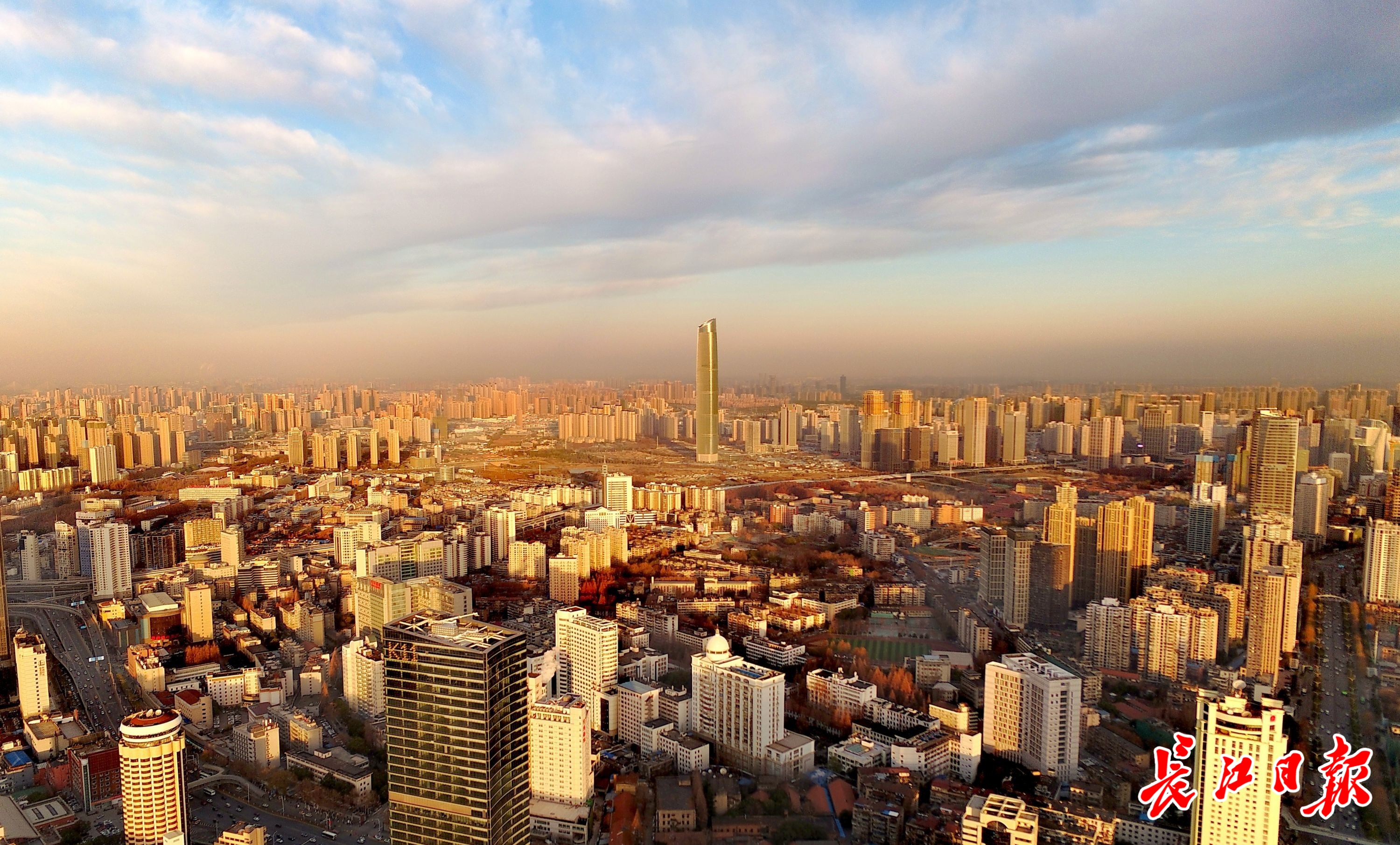 1月8日清晨,在汉口航空路鸟瞰,朝阳下的城市充满活力,一夜的北风使得城区能见度极高,漫天的云海让人感觉心情舒畅。长江网1月8日讯(记者詹松 摄影报道)
