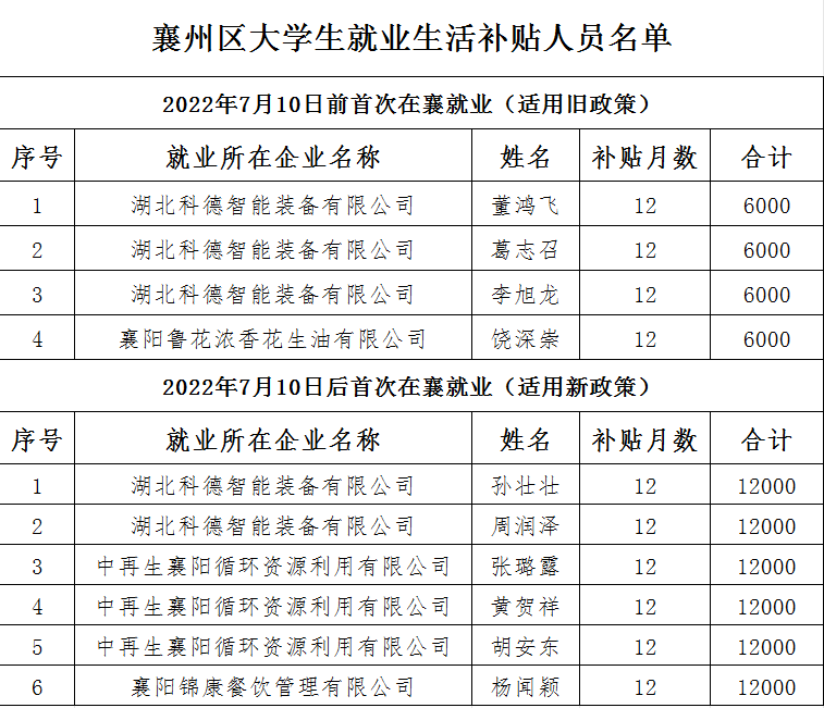 根据市人力资源和社会保障局《关于落实就业创业补贴有关政策的通知》(襄人社发〔2023〕7号)文件规定,2022年7月10日之前,全日制普通高校(含国家承认学历的境外院校,专科生、本科生)毕业学年起五年以内首次在襄企业就业,且与企业签订1年以上劳动合同,并在我市缴纳社会保险的高校毕业生,按每人每月500元标准发放生活补贴;在外租房的,自租赁住房合同(协议)签订之日起满1年,可按每人每月500元标准发放租赁住房补贴,一年一发放,最长期限不超过3年;2022年7月10之后,企业全职新引进的毕业5年内的全日制本(专)科生,并按规定在襄缴纳企业职工基本养老保险和其他社会保险,每人发放3.6万元就业生活补贴,分3年发放。在企业发放工资满1年后,由企业向同级公共就业和人才服务中心提出申请并初审。