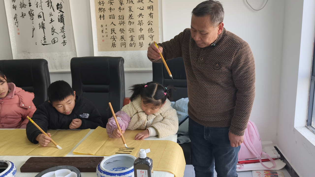 双沟镇梁咀村邀请襄阳本土书法家王清正等专业老师为托管班的孩子们讲授书法课。课堂上,老师们结合自身书法经验,悉心讲解毛笔的执笔姿势、运笔技巧,细致拆解汉字的间架结构,手把手指导孩子们一撇一捺认真书写。孩子们端坐桌前,凝神静气、挥毫泼墨,在一笔一画的练习中,感受中华书法的非遗底蕴和汉字的独特美感,在墨香浸润中传承中华优秀传统文化。