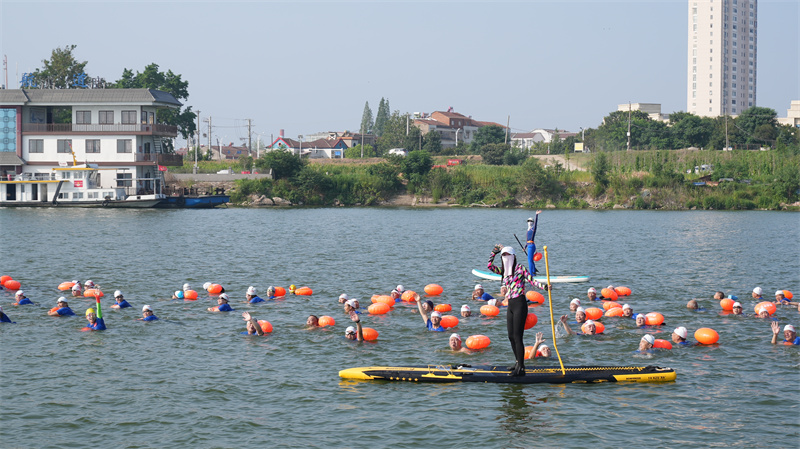 本网讯记者李锋 郑潘 钟军 通讯员周佩雨 贾玉芬报道:7月16日清晨,宜城市汉江窑湾码头段热闹非凡。160余名游泳爱好者齐聚于此,以逐浪汉江的方式纪念毛泽东主席畅游长江59周年,弘扬红色体育精神、倡导全民健身理念。副市长陈珊参加活动。