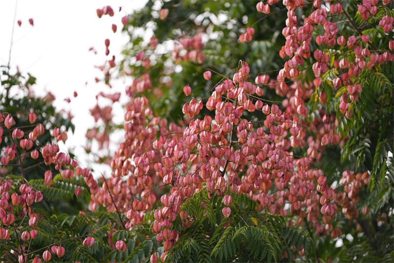 据了解,栾树因其花果的独特观赏性而备受青睐。每年8至9月,它开出金黄色的圆锥花序;入秋后,其果实为蒴果,由淡青逐渐转为粉红乃至深红,形态别致,因而也得名“灯笼树”,整体观赏期可持续数月。