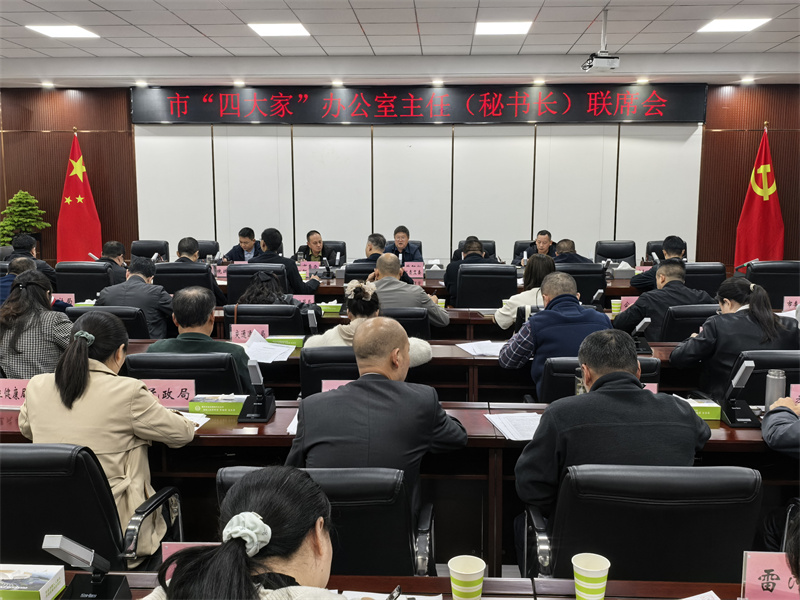 本网讯记者李明磊通讯员余吟阁报道:10月11日,宜城市“四大家”办公室主任(秘书长)联席会在人民会堂三楼会议室召开。会议传达中央、省、市关于整治形式主义为基层减负的相关会议精神及通报内容,解读相关政策规定和工作要求,听取各部门近期重点工作安排,并就下一步工作进行部署。市委常委、市委办主任曾劲松主持会议,市人大常委会党组成员王会书参加会议。