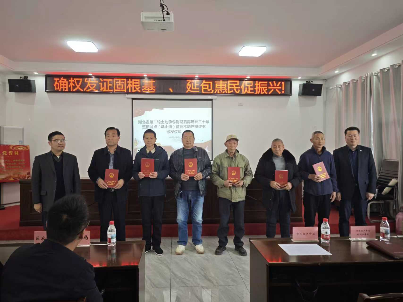 荆楚网(湖北日报网)讯(通讯员 邓军)近日,湖北省第二轮土地承包到期后再延长三十年整镇试点首批不动产权证书颁发仪式,在荆州区马山镇双龙村党群服务中心举行,首批14户群众集中领取崭新的不动产权证书。