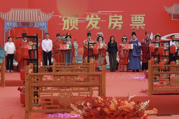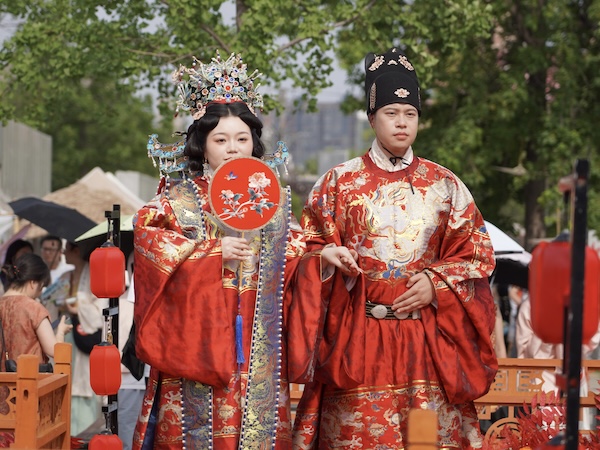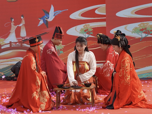 6对新人汉婚仪式亮相湖北陆羽茶文化旅游节。(记者冯凯 摄)
